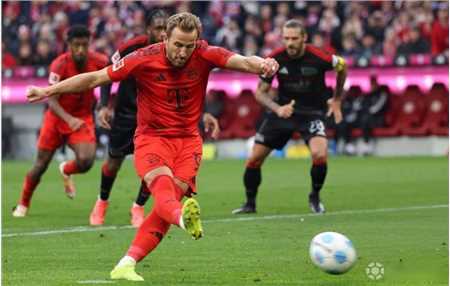 此役主场对阵柏林联合,凯恩上半场第15分钟主罚点球命中,帮助拜仁取得1-0领先。