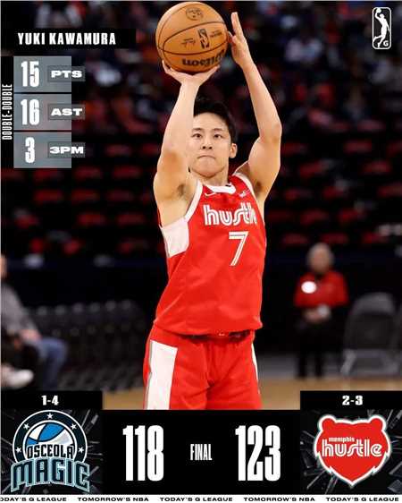 北京时间11月21日,一场发展联盟的比赛:孟菲斯疾行队(孟菲斯灰熊附属球队)123-118战胜莱克兰魔术队(奥兰多魔术附属球队)。河村勇辉爆发,打出了本赛季个人最强一战,拿到15分16助攻。得分平平无奇,助攻数太夸张。