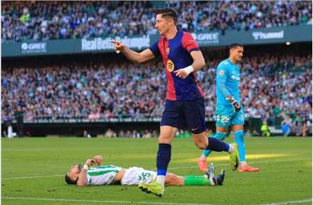 扛住主队开局三板斧的巴萨,随后彻底接管比赛,开始在场上围攻贝蒂斯,第39分钟打破了场上的平衡,亚马尔直塞策动进攻,孔德右路送出横传,门前包抄的莱万轻松推射建功,帮助巴塞罗那带着1-0的比分,回到了中场更衣室,联赛前16场打进16球的莱万,也成为了18-19赛季梅西后的西甲首人,而且也创造了历史,成为了西甲第一位在前17